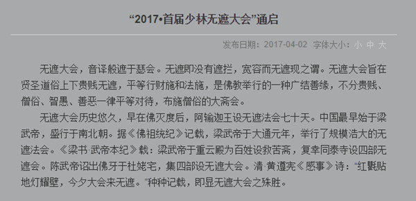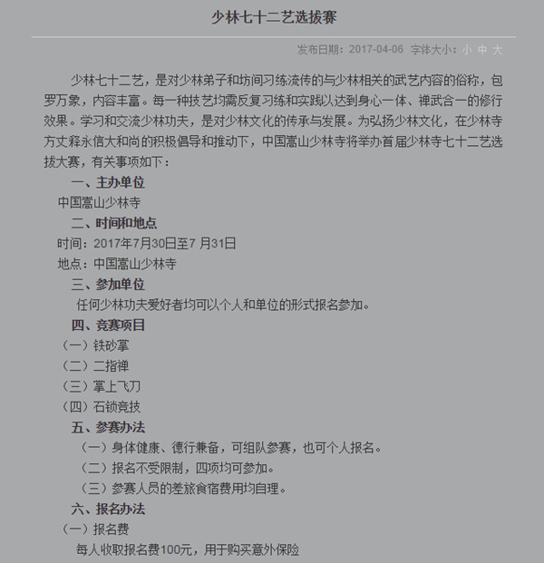 本届“无遮大会”筹备已久。早在今年4月6日,少林寺就已在其官方网站中发布消息。消息称,将于2017年7月30日至8月2日,举办首届“无遮大会”七十二艺选拔赛,面向全球发出“英雄帖”,邀请各路高手前来比武。