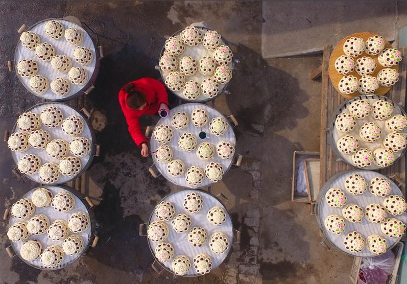 1月30日,在山东省聊城市阳谷县,村民在给蒸熟的花糕上色。春节临近,各地的面食制作艺人忙着赶制花糕、花馍、堆花团子等传统面食,以供应年节市场。新华社发(赵玉国 摄)