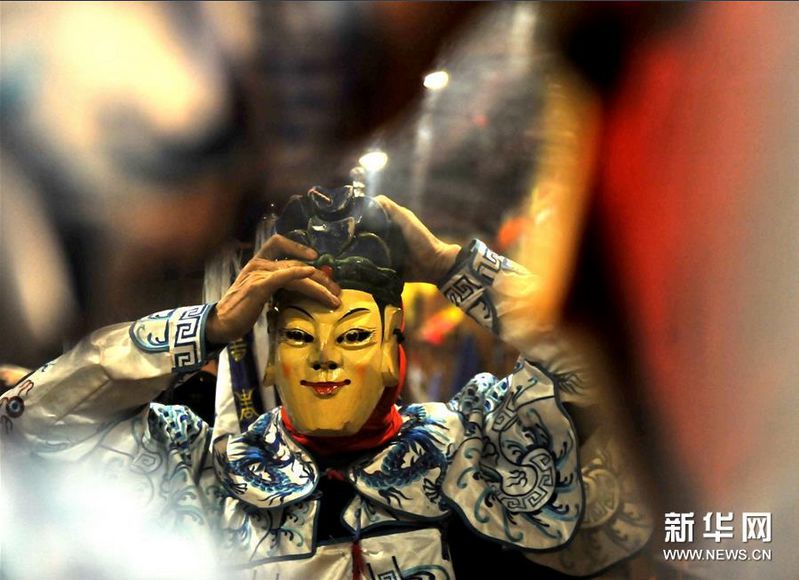 2月3日,贵州省黔南布依族苗族自治州福泉市道坪镇谷龙村的村民在佩戴面具准备排练阳戏,为春节展演做准备。福泉阳戏是傩戏的一种,深受当地群众喜爱,被列入贵州省级非遗名录。新华社发(蔡兴文 摄)