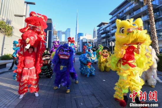 当地时间1月17日,中国大学生体育协会舞龙舞狮分会的大学生们在迪拜街头舞狮。当日,迪拜举行2020“欢乐春节”大巡游,迎接即将到来的中国农历新年。