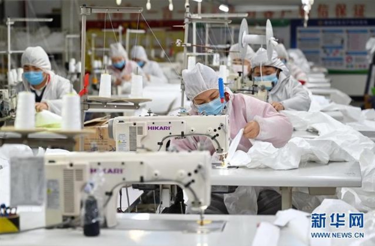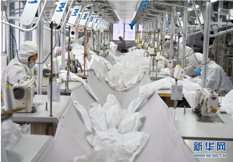 2月2日,在位于福州市仓山区的福建春晖服装科技有限公司生产车间,工人在赶制防护服。新华社记者 林善传 摄