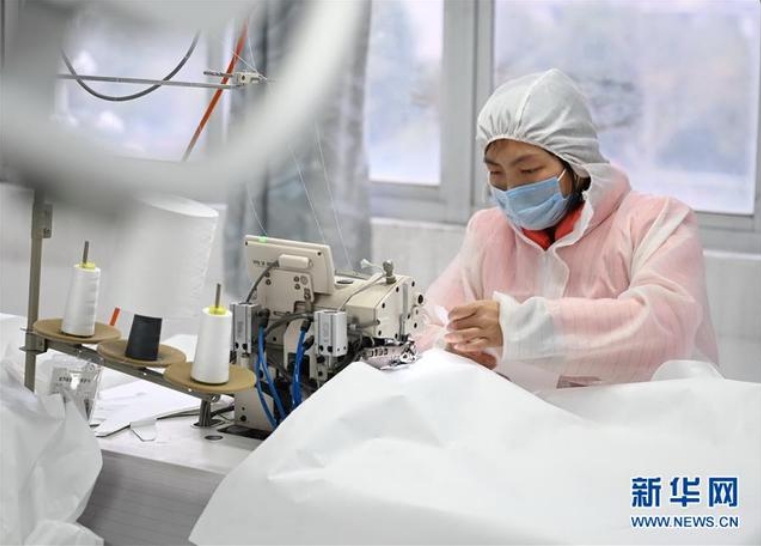 2月2日,在位于福州市仓山区的福建春晖服装科技有限公司生产车间,一名女工在赶制防护服。新华社记者 林善传 摄