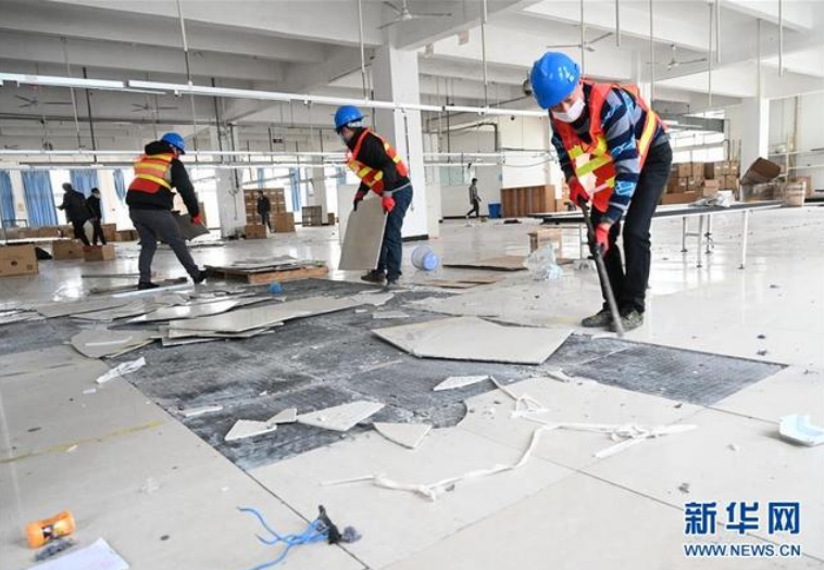 2月2日,位于福州市仓山区的福建春晖服装科技有限公司在相关部门协助下,紧急改造无菌车间,转产医用防护服。这是工人在进行车间改造。新华社记者 林善传 摄