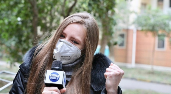 2月1日,华中科技大学俄罗斯留学生瑟尔瓦索娃高喊:“武汉,加油!” (中国日报记者 朱兴鑫 摄)