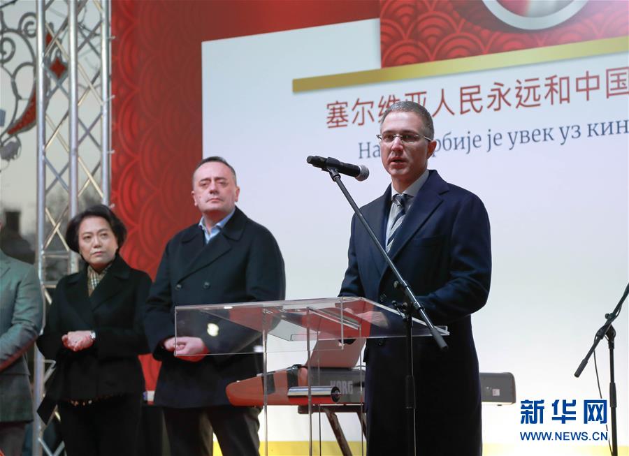 2月22日,在塞尔维亚首都贝尔格莱德,塞副总理兼内务部长斯特凡诺维奇(右)在声援中国抗击新冠肺炎疫情的音乐会上致辞。主题为“塞尔维亚人民永远和中国兄弟在一起”的音乐会22日在塞首都贝尔格莱德举行,向正在抗击新冠肺炎疫情的中国人民表示支持。新华社记者 石中玉 摄
