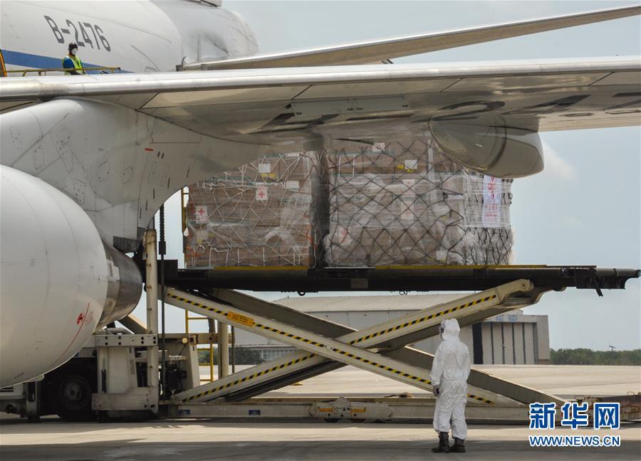 4月6日,加纳首都阿克拉的科托卡国际机场工作人员从包机上卸载物资。 中国援助18个非洲国家的抗疫物资6日运抵加纳。除加纳外,这批物资还将在这里中转运往其他17个国家,以帮助当地抗击新冠疫情。 新华社记者 许正 摄
