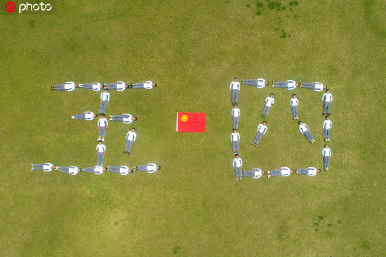 2020年5月2日,浙江省湖州市长兴职教中心,青年学生在操场上摆出“五四”造型,与团旗合影。(无人机航拍)