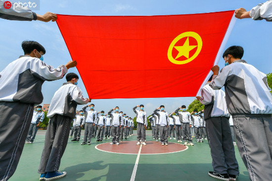 2020年5月2日,浙江省湖州市长兴职教中心,青年学生代表挥舞团旗,高唱团歌。