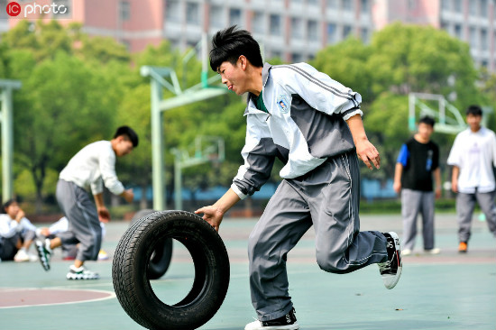 2020年5月2日,浙江省湖州市长兴职教中心,青年学生正在进行风火轮趣味运动。