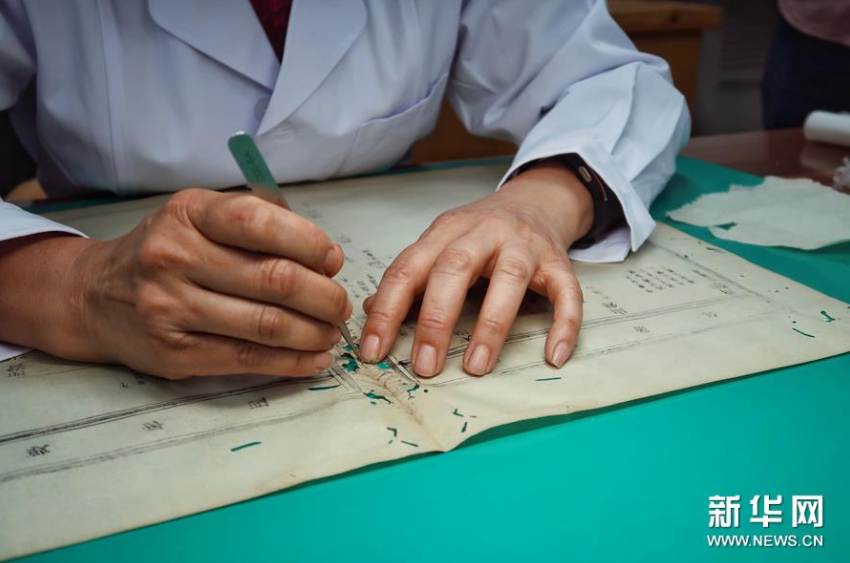 5月13日,古籍修复师在对书页进行修复。新华社记者 郑梦雨 摄