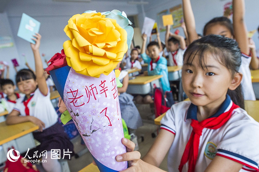 在三十六个教师节来临之际,江苏连云港市黄海路小学举行主题活动,祝福老师,迎接教师节。 司伟/摄
