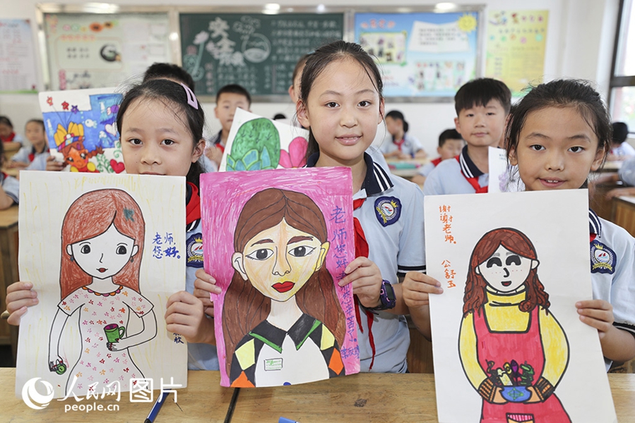 在三十六个教师节来临之际,江苏省苏州市平直实验小学校的学生们纷纷用彩笔画出了心目中最美老师形像,并将画作送给老师。华雪根/摄
