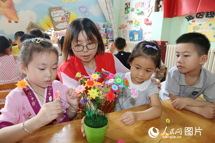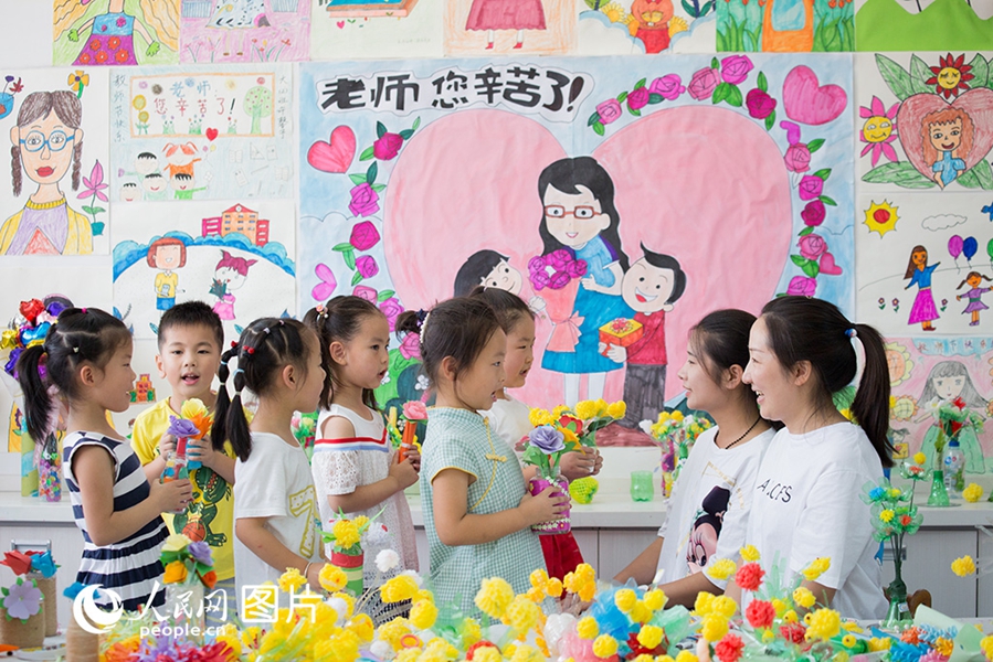 2020年9月8日,安徽省合肥市明光路街道团工委环保志愿者走进辖区御景湾幼儿园,指导小朋友利用废旧物品制作手工花束送给老师,表达对恩师的感激之情和节日祝福。熊伟/摄