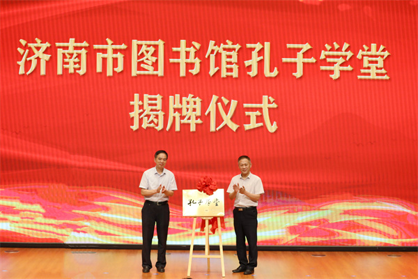 尼山世界儒学中心(中国孔子基金会秘书处)二级巡视员康承宝、济南市文化和旅游局副局长郭象峥为济南图书馆孔子学堂授牌
