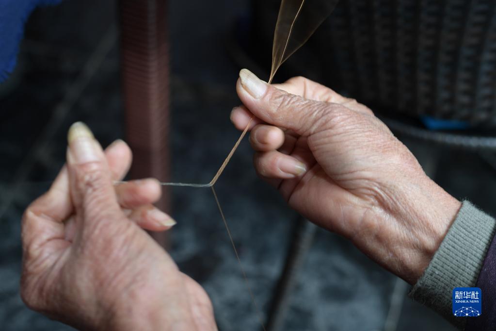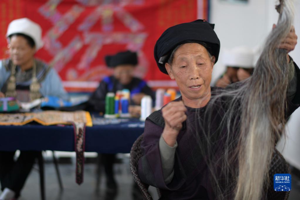 11月2日,在黔南布依族苗族自治州三都水族自治县中和镇雪花湖移民社区一家马尾绣手工坊,水族手工艺人在搓马尾线。