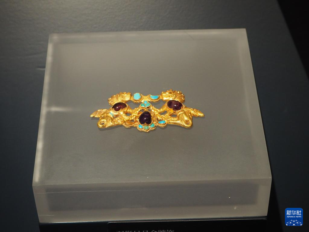 二狮相向,或衔日或拱月,鬃毛怒张,狮身各镶嵌一枚紫水晶,其余部分镶嵌绿松石……出土于2018血渭一号墓的双狮日月金牌饰是重要展出文物之一。“这是2018血渭一号墓科学考古发掘出土文物的首次展出。”孙丽宁介绍,此次青海考古成果展精选了7件2018血渭一号墓考古出土文物进行展示。