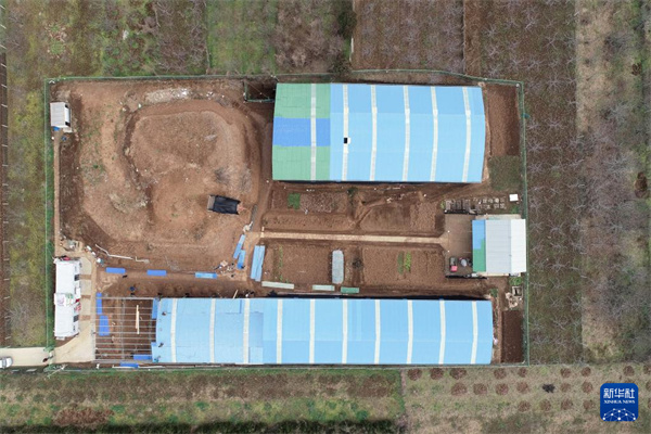 12月16日拍摄的江村大墓外藏坑发掘现场(无人机照片 张博文 摄)