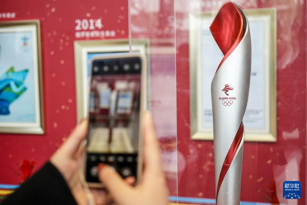 1月4日,一名观众用手机拍摄展出的北京2022年冬奥会火炬。