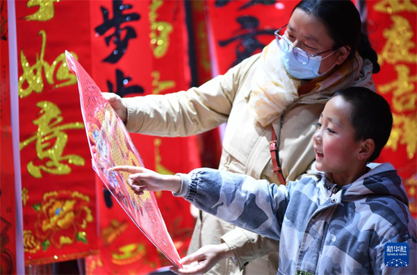 1月12日,一对母子在湖北省襄阳市保康县一家年货商店挑选春节饰品。