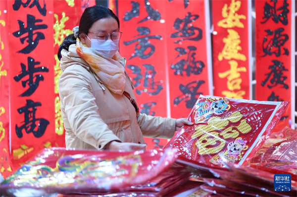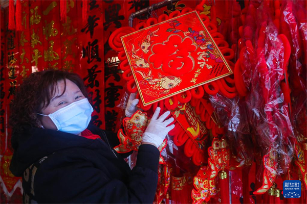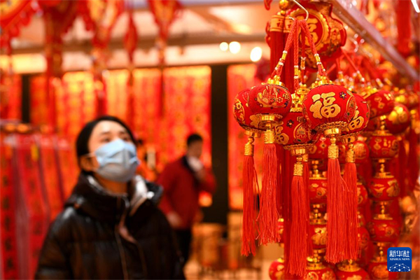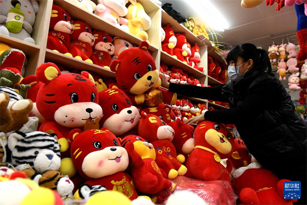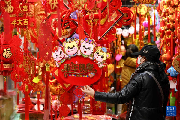 农历虎年春节将至,各地年货市场年味渐浓,人们忙着选购春节饰品,红红火火迎接新春佳节。