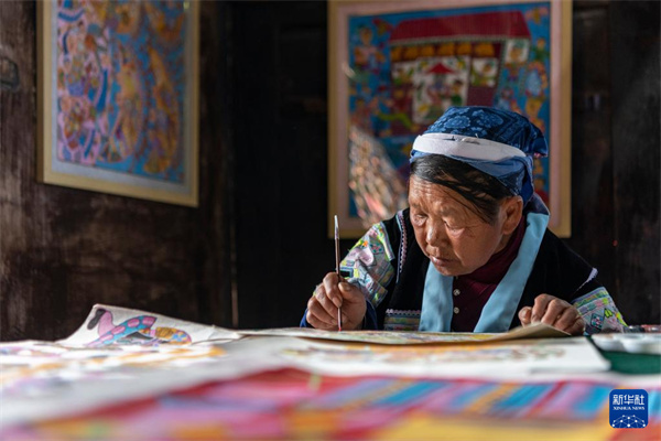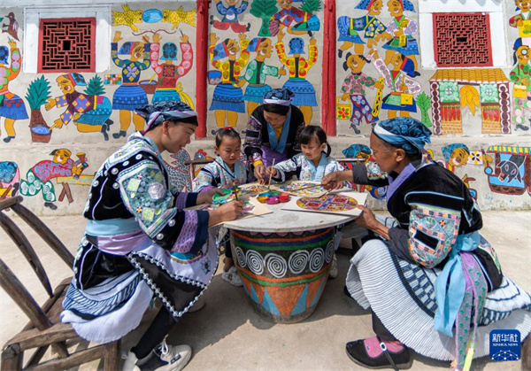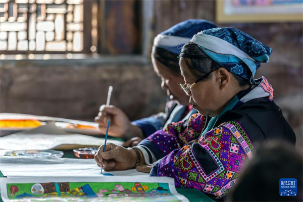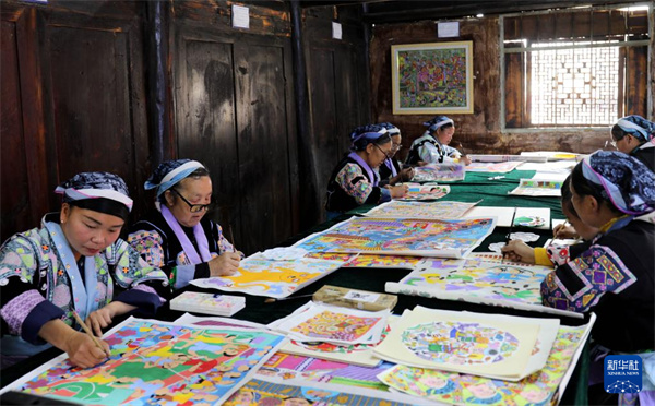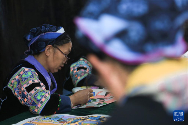 3月19日,村民在贵州省黔南布依族苗族自治州龙里县洗马镇平坡村创作苗画。