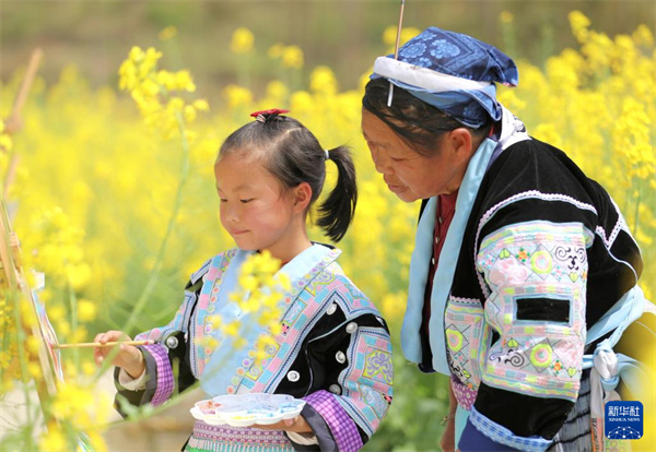 3月19日,贵州省黔南布依族苗族自治州龙里县洗马镇平坡村村民在户外指导小朋友写生。
