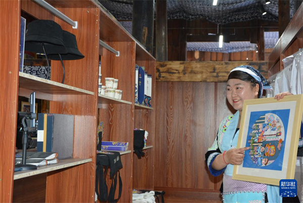 3月19日,村民在贵州省黔南布依族苗族自治州龙里县洗马镇平坡村通过直播销售苗画。