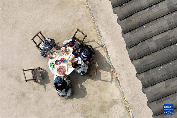 3月19日,村民在贵州省黔南布依族苗族自治州龙里县洗马镇平坡村创作苗画(无人机照片)。