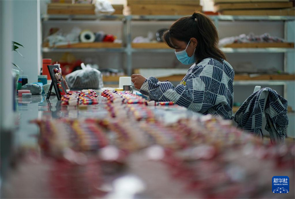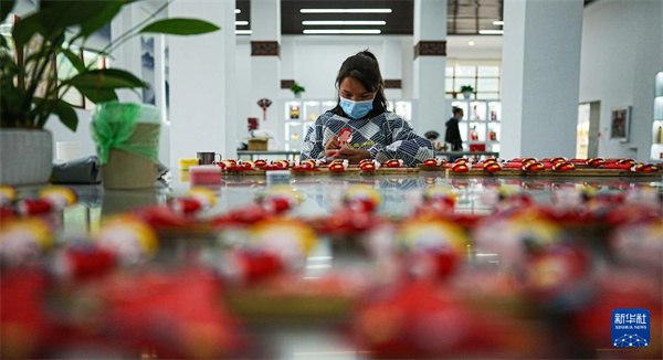 云南省文山壮族苗族自治州西畴县瓦厂村村民在制作彩绘文创产品(3月27日摄)