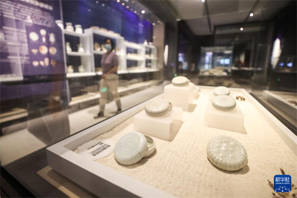 海南省博物馆“南溟奇甸”南海海洋文明陈列展展出的青白釉印花粉盒(4月24日摄)。