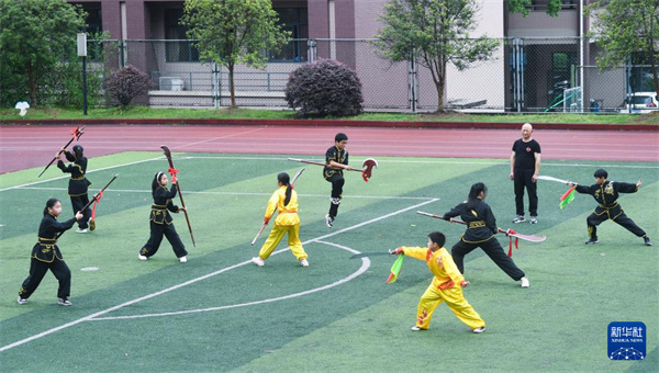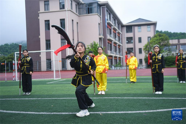 4月26日,板桥镇板桥小学的学生在练习传统的“十八般武艺”。“十八般武艺”是流行于浙江省杭州市余杭区的传统体育运动,由十八般古兵器操练法演变而来,作为浙江省级非遗项目列入该校“第二课堂”特色课程。