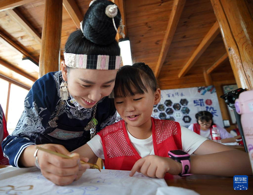 7月20日,苗族蜡染技艺传承人张义苹(左一)在贵州省黔东南苗族侗族自治州丹寨县龙泉镇卡拉村苗族蜡染工坊内指导一名小朋友学画蜡画。
