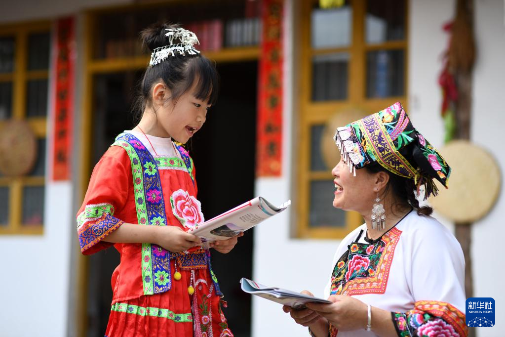 7月19日,湖南省邵阳市城步苗族自治县长安营镇民族文化传播服务中心,一名小朋友在向“六月六”山歌节市级传承人陈岩花(右)学习唱山歌。