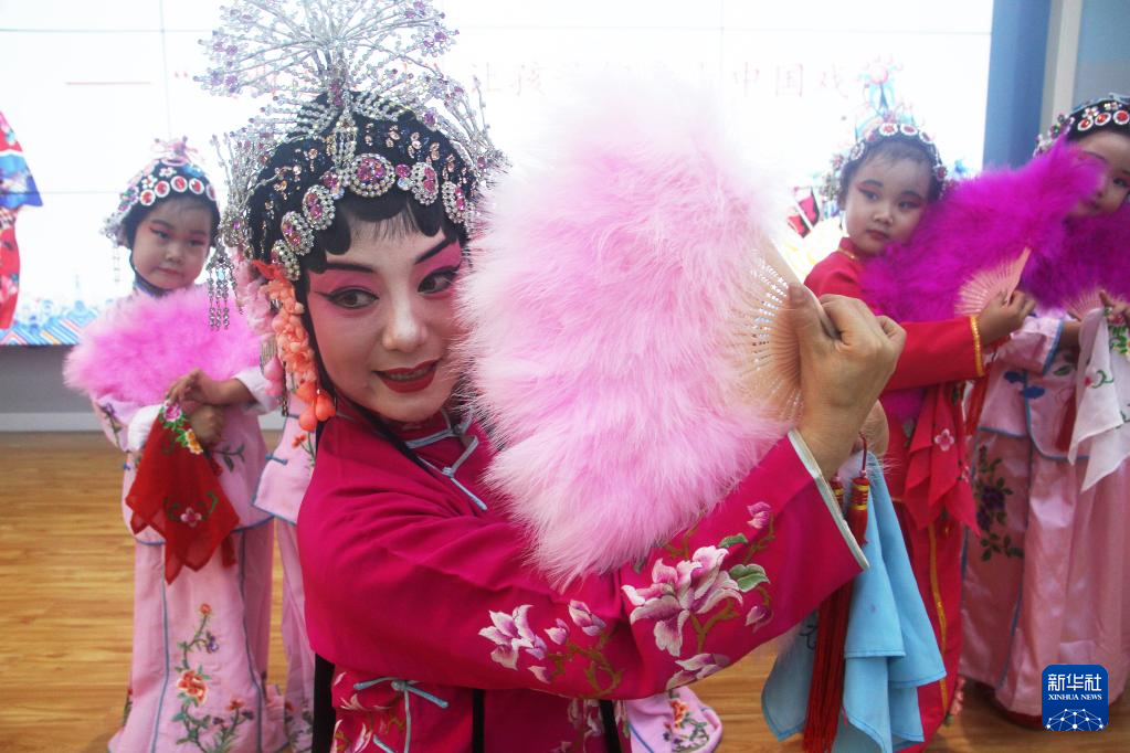 7月20日,在河北省唐山市丰润区太平路街道同庆社区,戏曲老师指导小朋友练习戏曲动作。