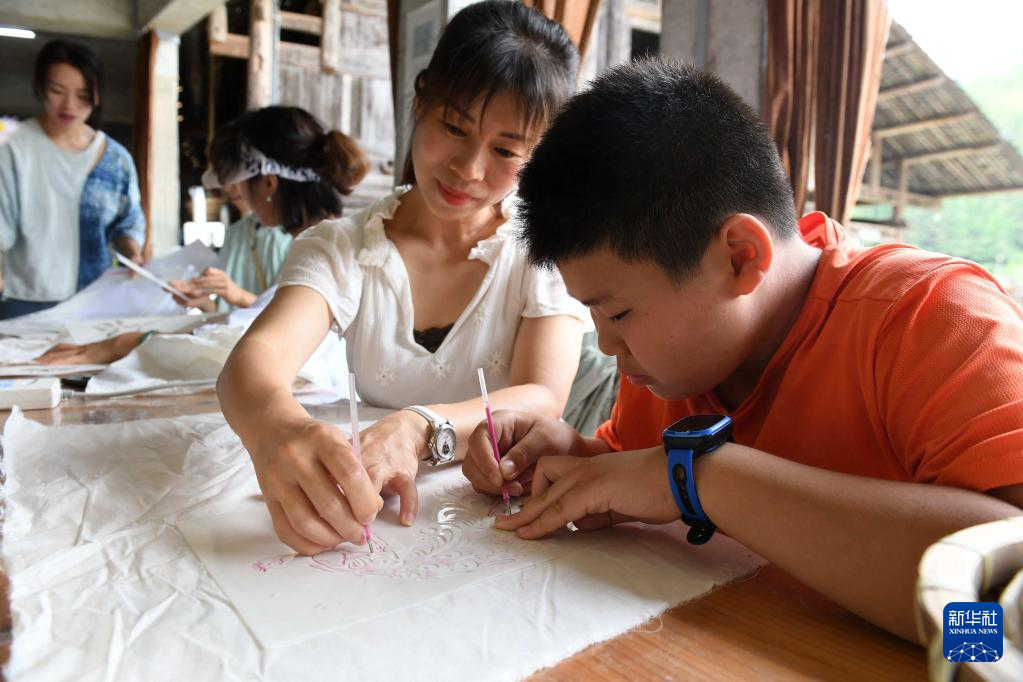 7月20日,在贵州省榕江县栽麻镇丰登侗寨,一名母亲与孩子一起制作蜡画。