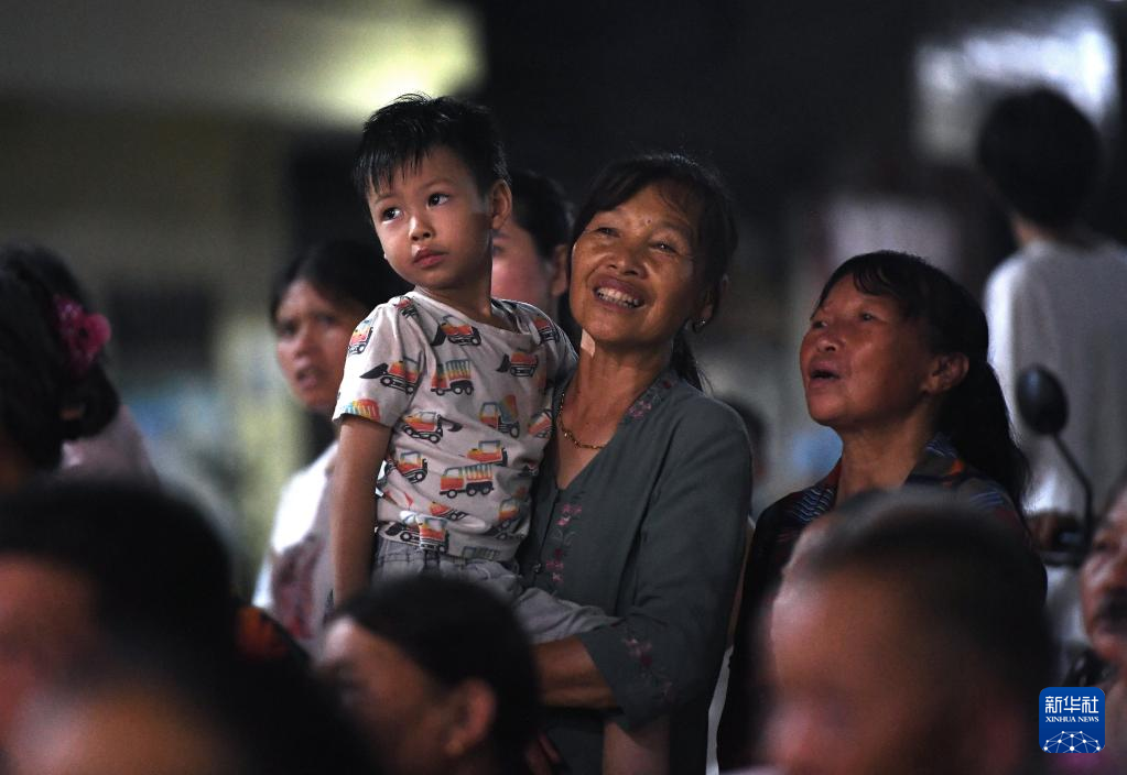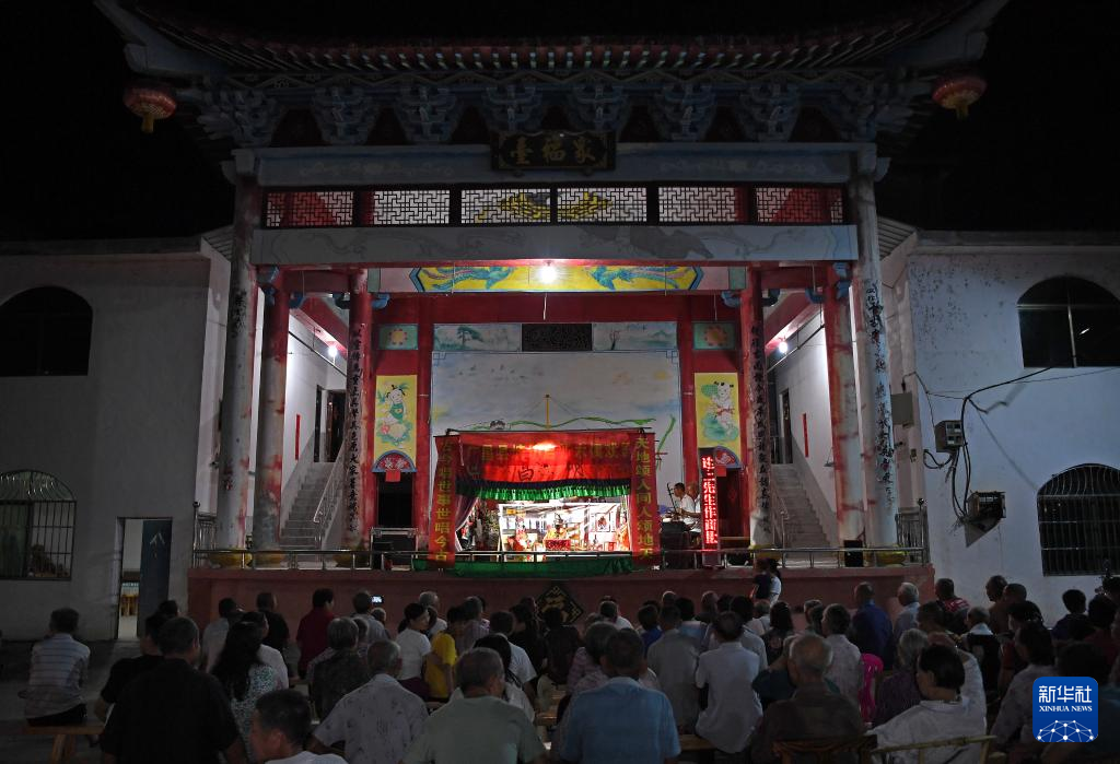 在江西省广昌县塘坊镇大株村,村民们在观看木偶戏演出(8月10日摄)。