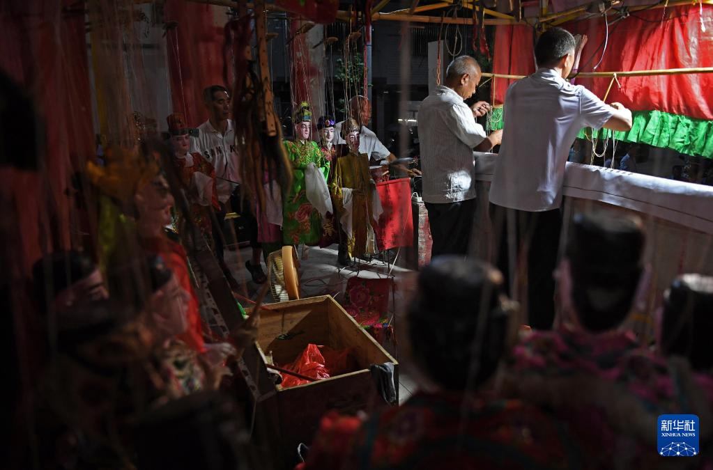 在江西省广昌县塘坊镇大株村,木偶剧团成员在表演木偶戏(8月10日摄)。