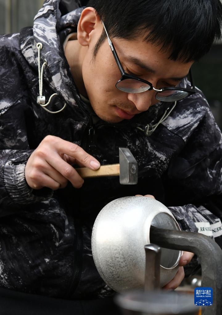 2月8日,河北省沧县杜林乡一家银器制作工坊的工人在制作银器工艺品。