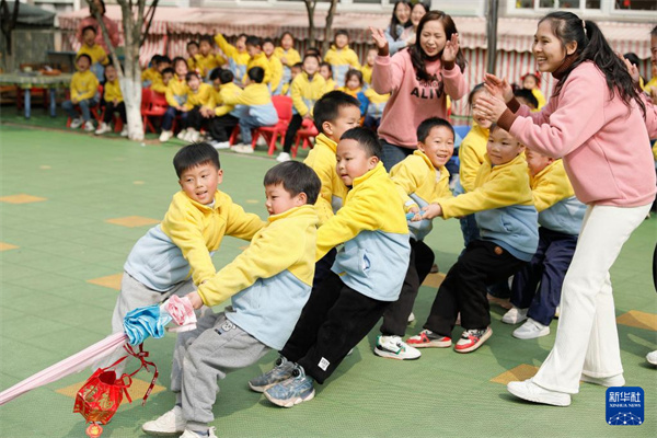 2月20日,江西省吉安市吉州区保育院的孩子们在“二月二 龙抬头”活动上参加拔河比赛。新华社发(李军 摄)