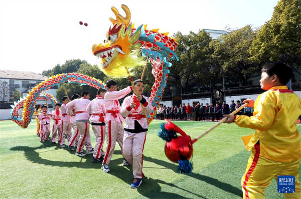 2月20日,江苏省苏州市昇平实验小学校学生表演舞龙,迎接“二月二”。新华社发(杭兴微 摄)