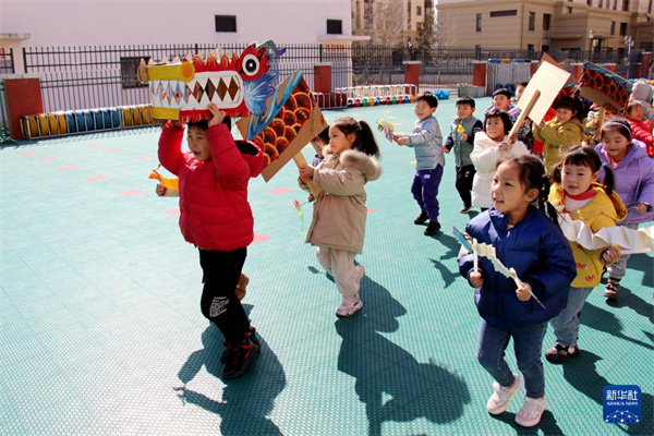 2月20日,山东省青岛西海岸新区胶南中心幼儿园的小朋友在“二月二 龙抬头”主题活动中用自制的道具舞龙。新华社发 (王培珂 摄)