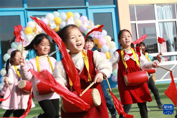 2月20日,山东省高密市密水街道中心幼儿园的孩子们在打腰鼓。新华社发(李海涛 摄)