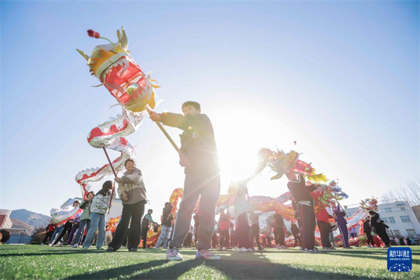 2月20日,河北省遵化市东旧寨镇梁屯中心小学的学生表演舞龙。新华社发(刘满仓 摄)