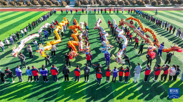 2月20日,河北省遵化市东旧寨镇梁屯中心小学的学生表演舞龙(无人机照片)。新华社发(刘满仓 摄)