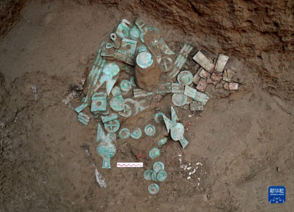 河南安阳殷墟商王陵祭祀坑K23出土的青铜器(拼版资料照片)。新华社发