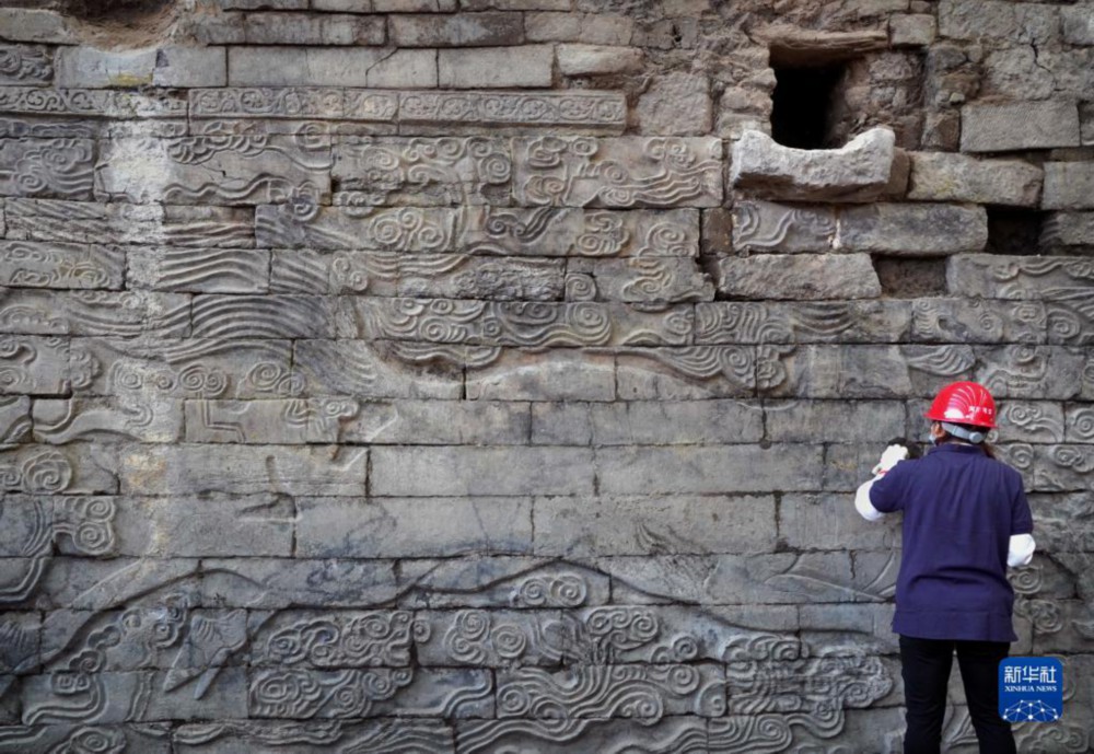 工作人员在清理河南开封州桥遗址出土的巨幅石雕祥瑞壁画(2022年9月21日摄)。新华社记者 李安 摄