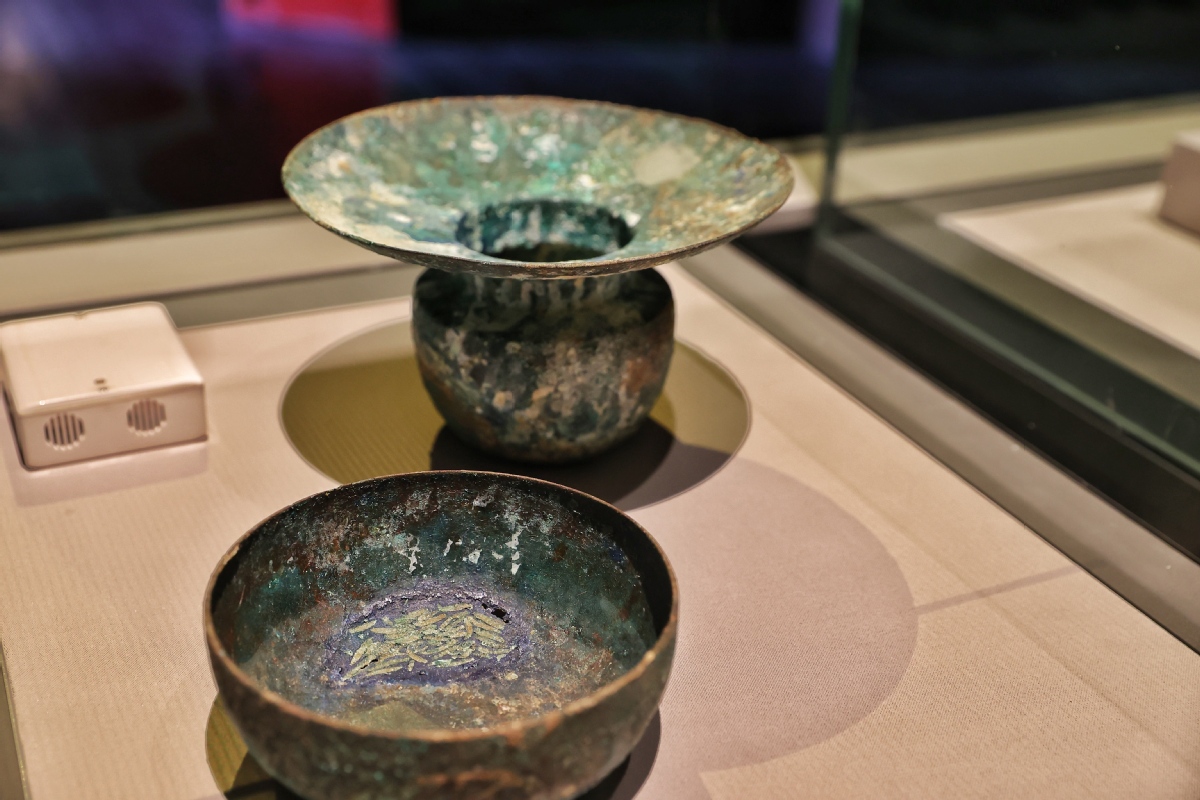8月31日,展览上展出的铜渣斗与茶叶遗存(陕西省蓝田县吕氏家族墓出土)。中国日报记者姜东摄