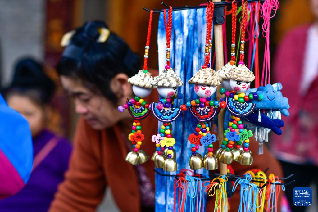 12月15日,在贵州省黎平县肇兴侗寨,侗族群众在侗年年货集市销售文创产品。新华社记者 杨文斌 摄