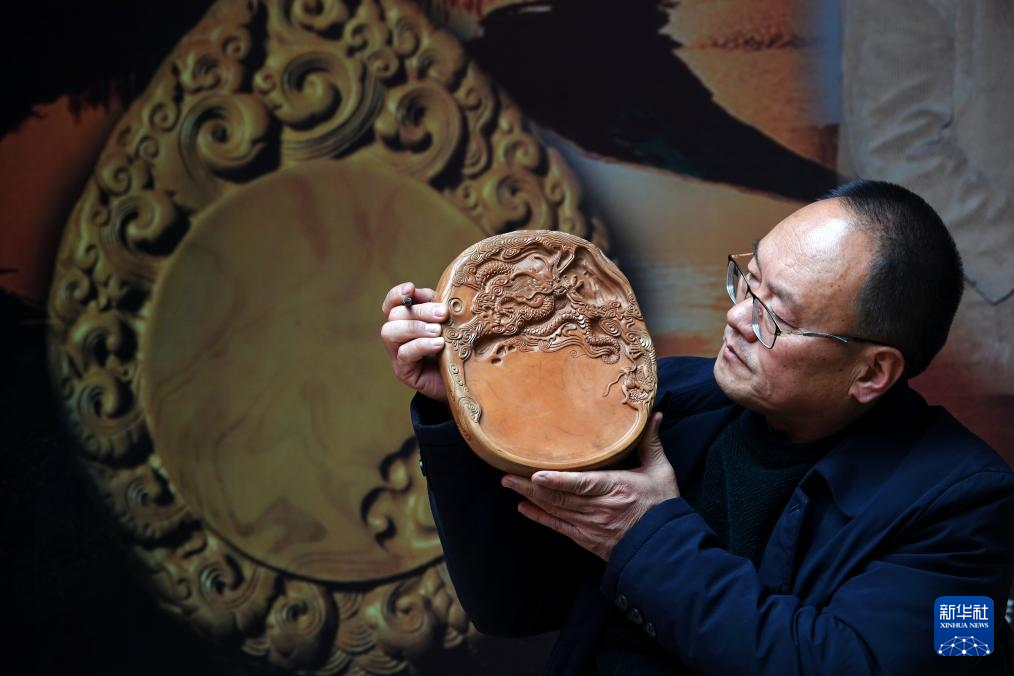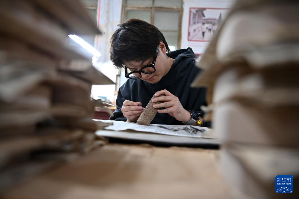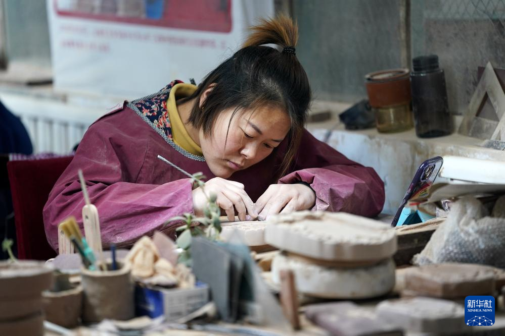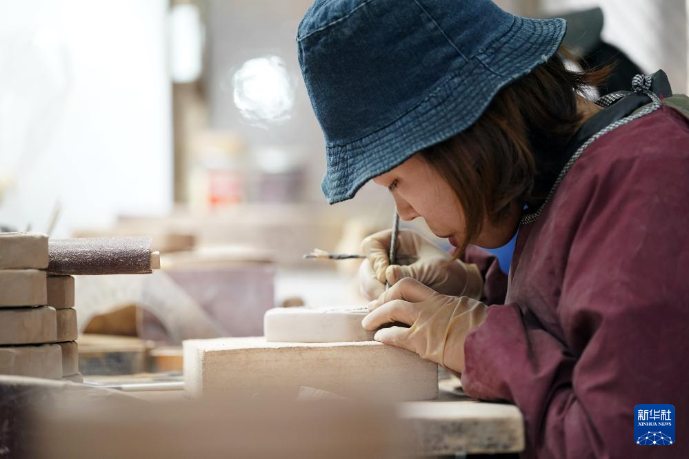 在山西省新绛县光村绛州澄泥砚生产基地,蔺霄麟在雕刻澄泥砚(2023年2月14日摄)。新华社记者 杨晨光 摄