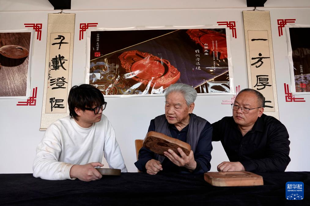在山西省新绛县光村绛州澄泥砚生产基地,蔺永茂(中)和儿子蔺涛(右)、孙子蔺霄麟交流澄泥砚制作心得(2023年3月9日摄)。新华社发(高新生 摄)